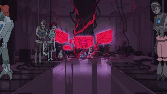 It delivers the food and drink to Entrapta, who uses her prehensile hair to eat and drink. She is interacting with a First Ones' artifact, a Data Disk, using a fancy computer. She recorded a video message, appearing to be documenting her findings, saying this could contain the secrets of the First Ones. Red vines started growing out of the artifact, covering Entrapta's computer and turning the screens red. This sent out a blast and activated an alarm on top of the castle. Her robots' eyes turned red, and they started surrounding Entrapta. She exclaimed that the robots are responding to her code. The delivery robot broke her trash can, and threw it at Entrapta as she mused about making modern and ancient technology compatible. As a mass of robots gathered in front of her, she announced in her log that she is now going to run.